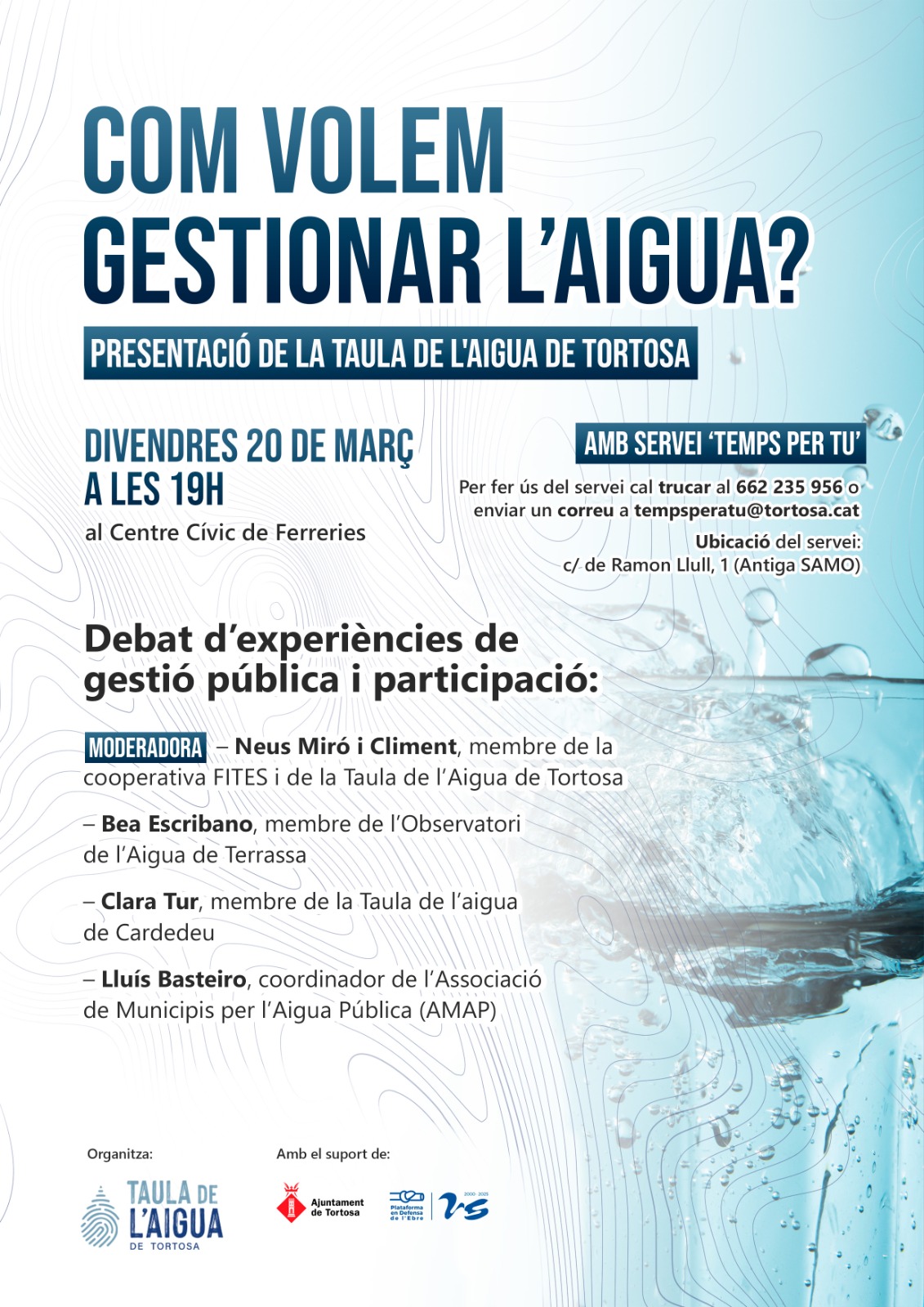 La Taula de l’Aigua de Tortosa es presentarà públicament el proper divendres 20 de març a les 19 hores al Centre Cívic de Ferreries, amb un acte obert a la ciutadania que posarà el focus en la gestió pública de l’aigua i en els mecanismes de participació i control democràtic del servei.